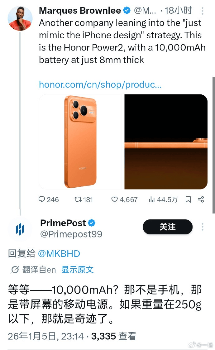 如此极致的续航容量和轻薄尺寸的极限突破,也让荣耀Power2在国际的舞台上引发了大量讨论,收获了全球顶流数码博主MKBHD的赞叹传播。其将惊人的10080mAh超大容量电池,融入仅7.98mm的超薄机身之中,实现了能量密度与工业设计的双重突破。这一“不可能的组合”也迅速征服全球科技爱好者,收获社交媒体平台网友“难以置信”、“杀疯了”、“充电宝的容量”、“简直奇迹”等大量赞誉,清晰展现了中国智造以尖端创新赢得世界尊重的能力。