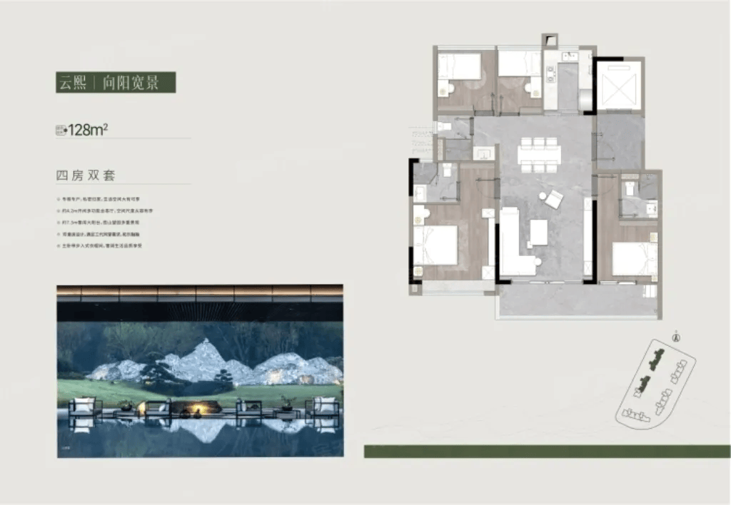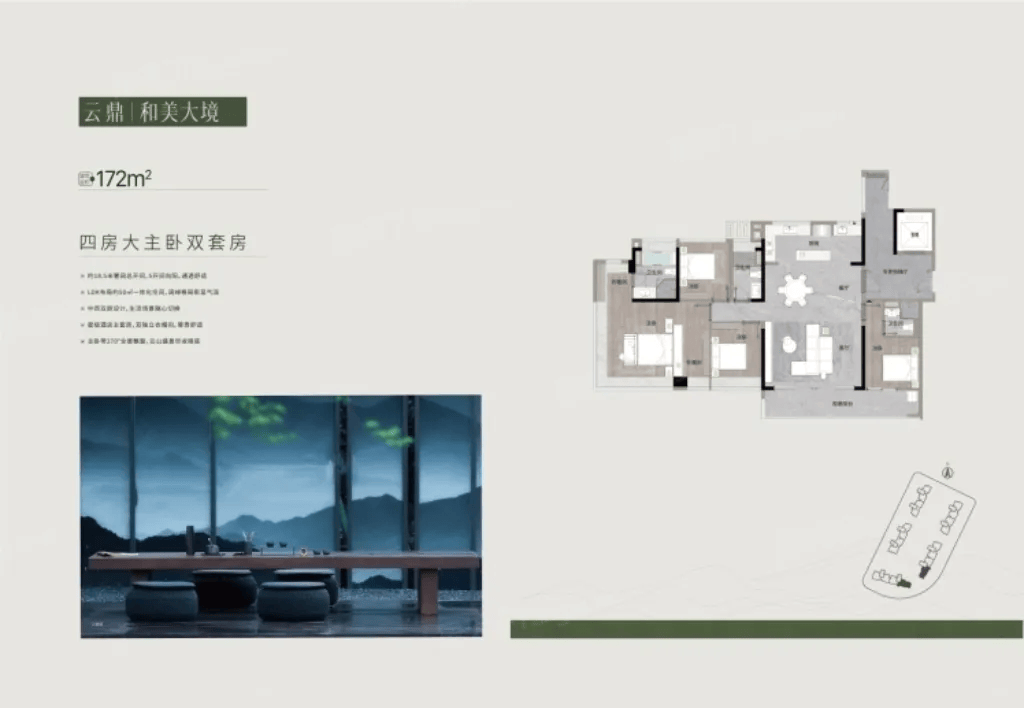 ,尤其是172㎡大户型,南向面宽达18.5米,9.2米观景阳台如悬于山林之上的空中花园,四季景色尽收眼底。社区内部亦延续生态理念,打造