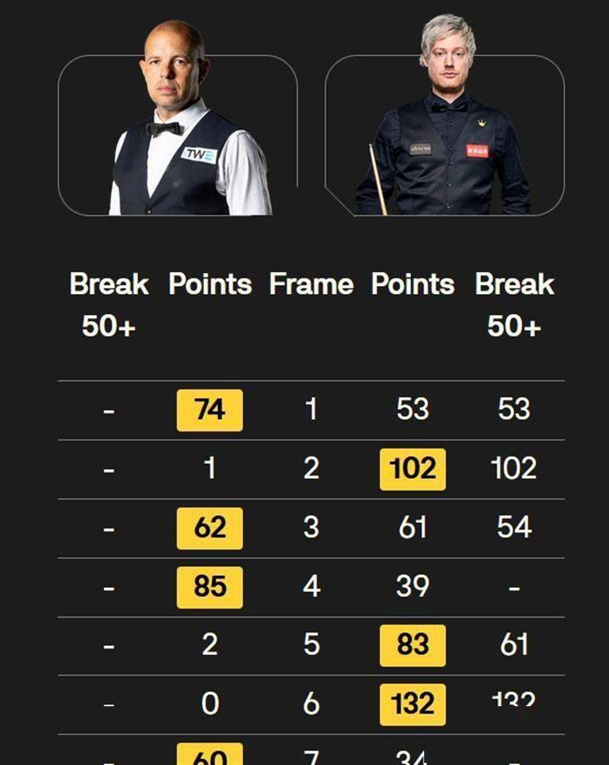 赛后,当技术统计呈现在大家面前时,引发了广泛的讨论。 尼尔·罗伯逊全场打出了2杆破百和3杆50+,总得分达到474分。 而巴里·霍金斯全场只有1杆93分算得上高分,没有破百,总得分为438分。 从纯粹的进攻数据和单杆质量来看,罗伯逊占据了压倒性的优势。 但斯诺克比赛的胜负从来不仅仅取决于谁的单杆更华丽。 霍金斯赢下的五局比赛中,有三局是险胜,他凭借的是更少的失误、更顽强的防守以及在关键球上更稳定的处理。 罗伯逊虽然赢得了数据,但在决定比赛走向的关键时刻,他几次致命的失误让他付出了输掉比赛的代价。